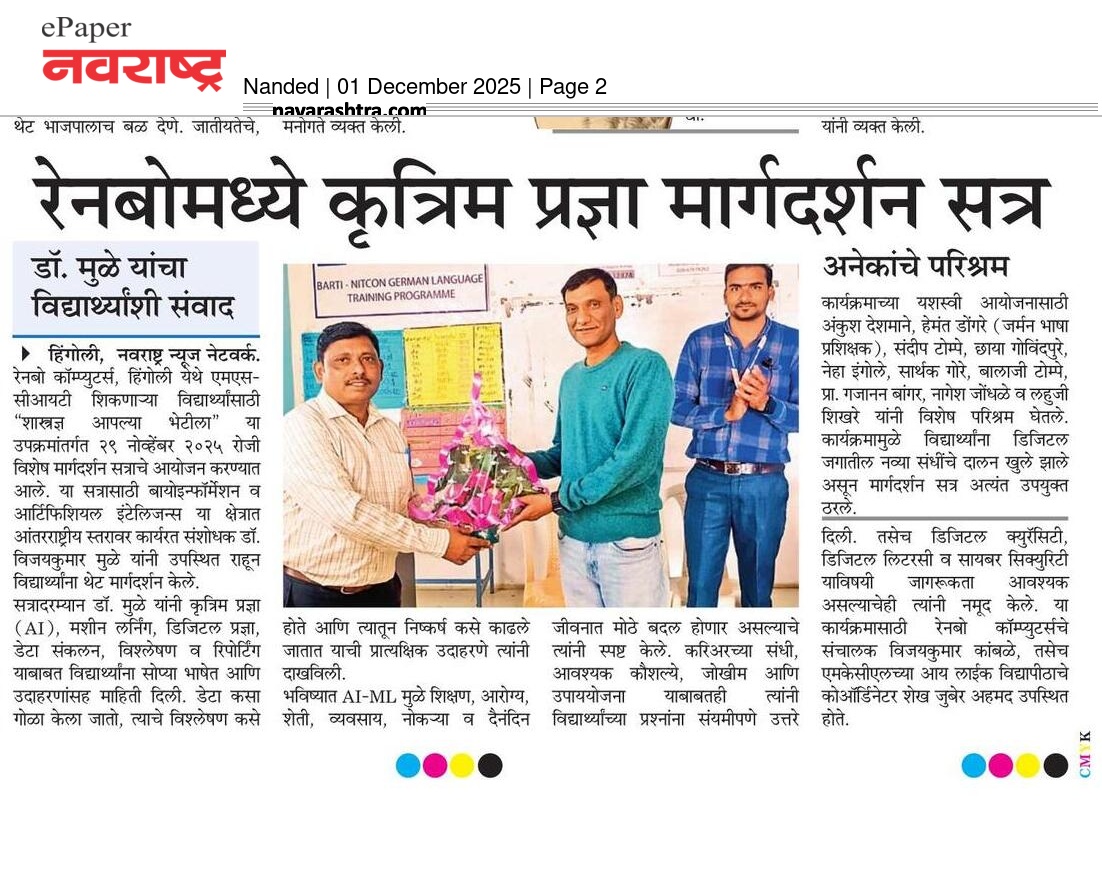 "मी Rainbow Computers, हिंगोली येथे Web Development कोर्स पूर्ण केला आणि आज मी Web Developer म्हणून काम करत आहे. Rainbow Computers येथील प्रॅक्टिकल ट्रेनिंग, मार्गदर्शन आणि अनुभवामुळे माझ्या करिअरमध्ये आत्मविश्वास आणि कौशल्य वाढले. मनःपूर्वक धन्यवाद Rainbow Computers.